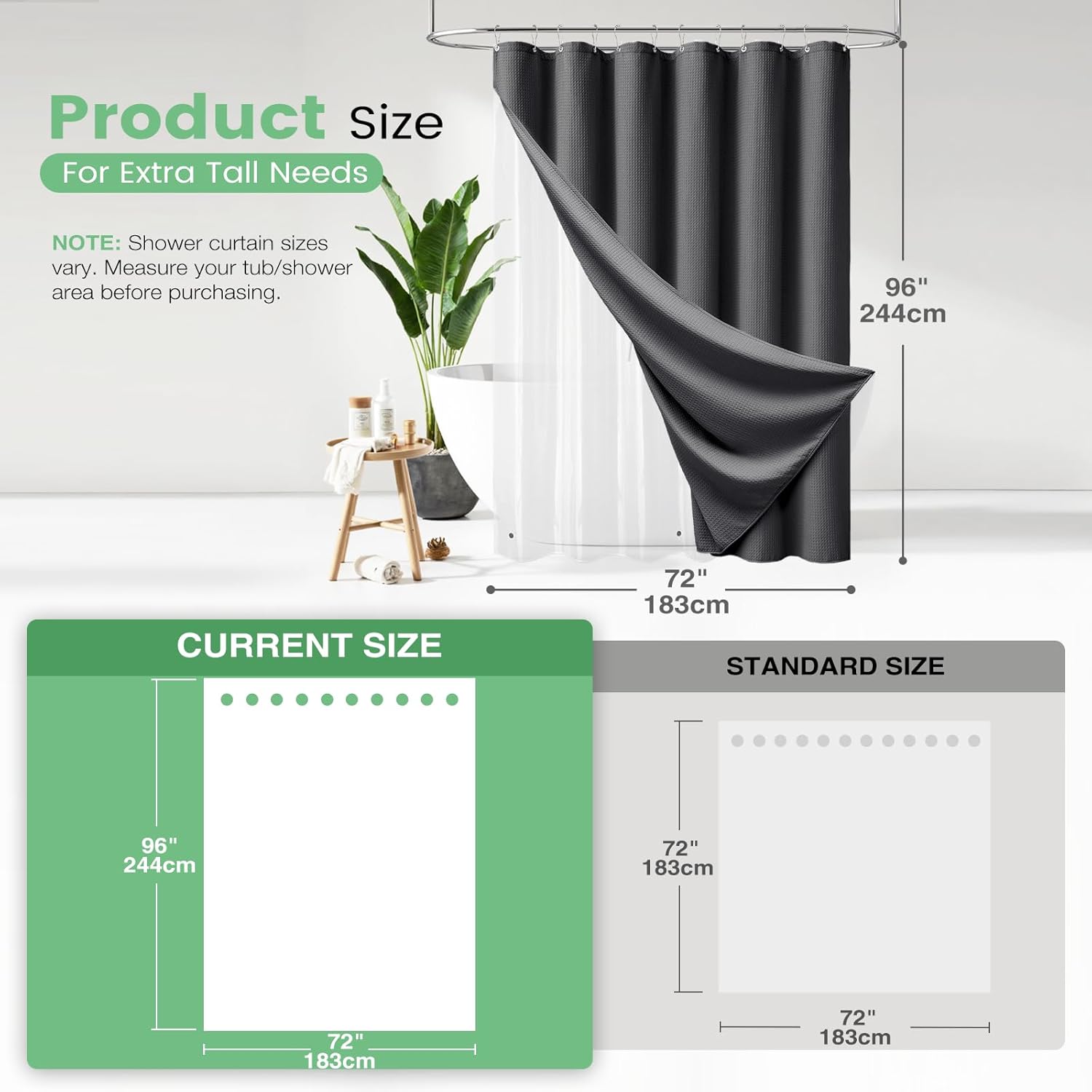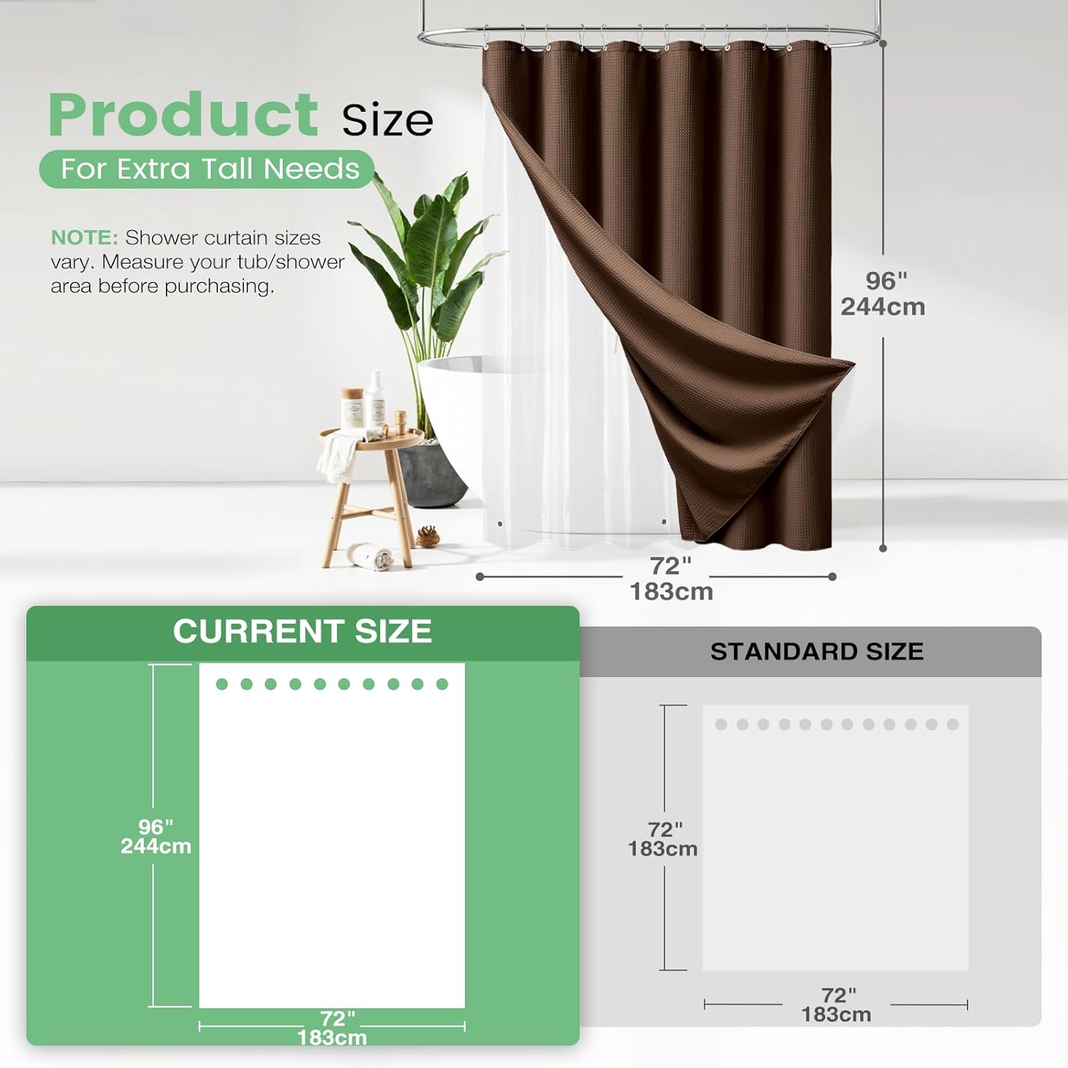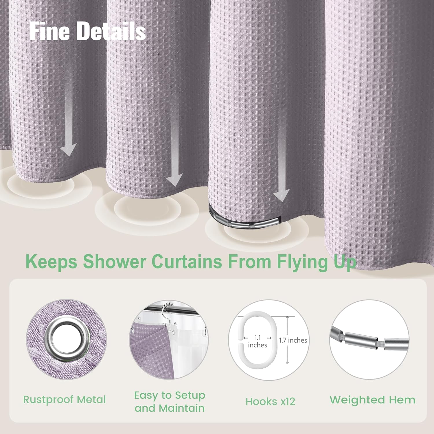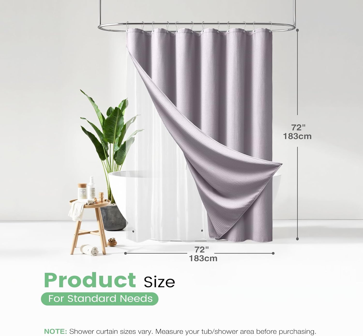 Elegant and Durable Fabric Shower Curtain with Waffle Weave ► PREMIUM QUALITY: 256 GSM heavy duty fabric shower curtain with classic waffle-weave pattern brighten up your bathroom with elegance and luxury. Simple design and fashionable appearance beautify your home decor. ► WATER REPELLENT: Hospitality standard and treatment for water repellent allows water to bead on the surface of the shower curtain. ► DURABLE: Extra Heavy duty fabric and tight hem keep the curtain from being torn up. Equipped with 12 rust-resistant metal grommets, this curtain enjoys lasting use. ► STANDARD MEASUREMENT: 72"*80" long shower curtain fits for your standard size. ► CARE INSTRUCTIONS: Machine wash cold; Gentle cycle; Don't bleach; Hang dry; No shrinkage, No deformation.