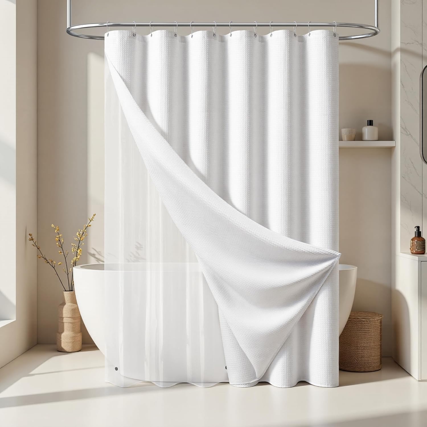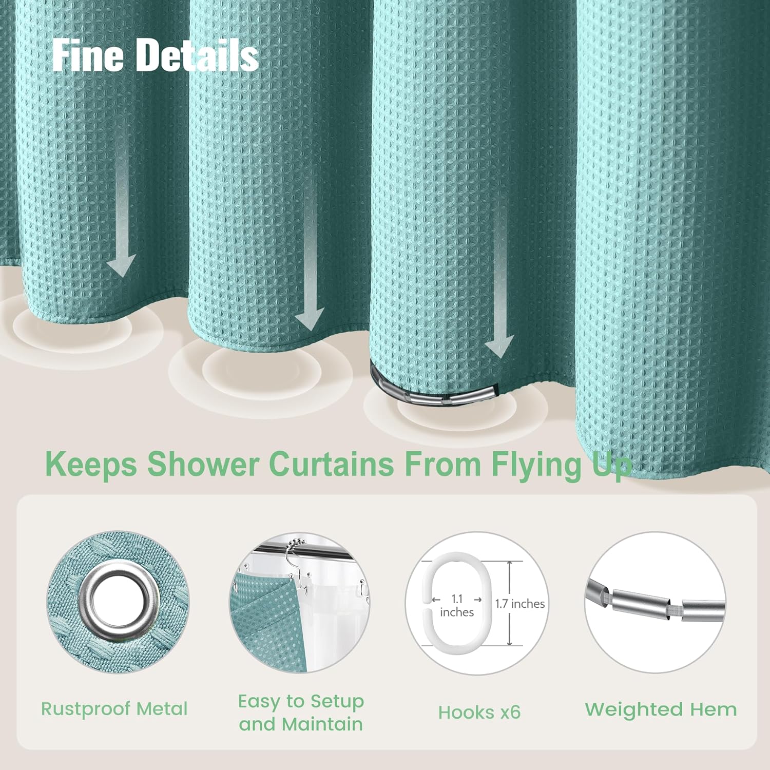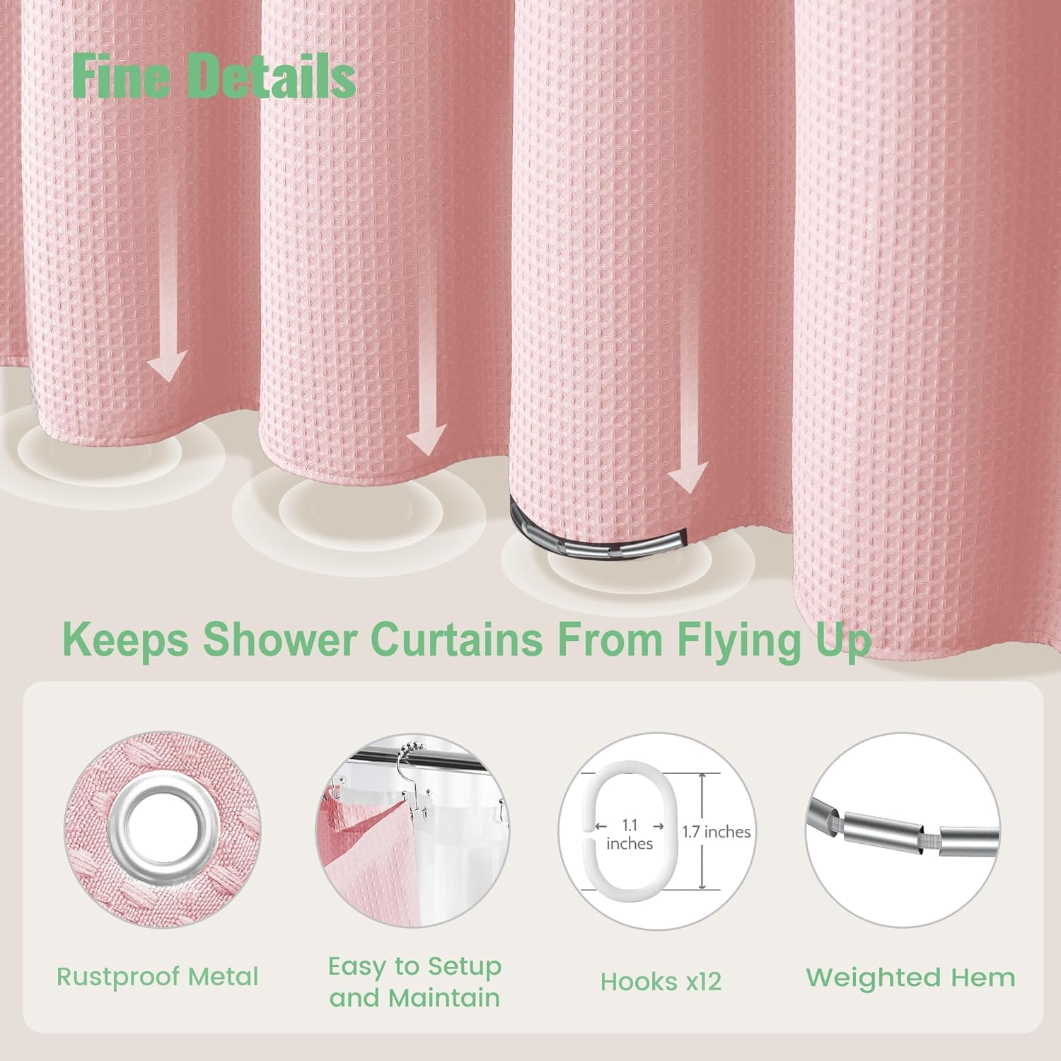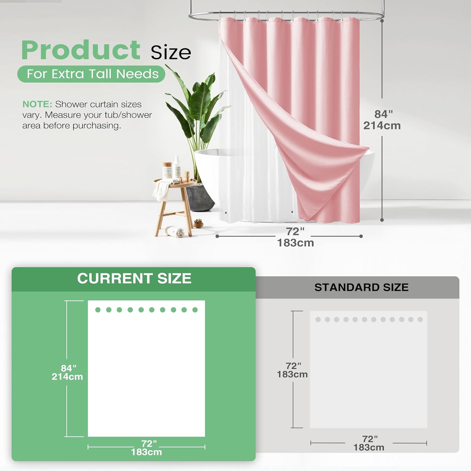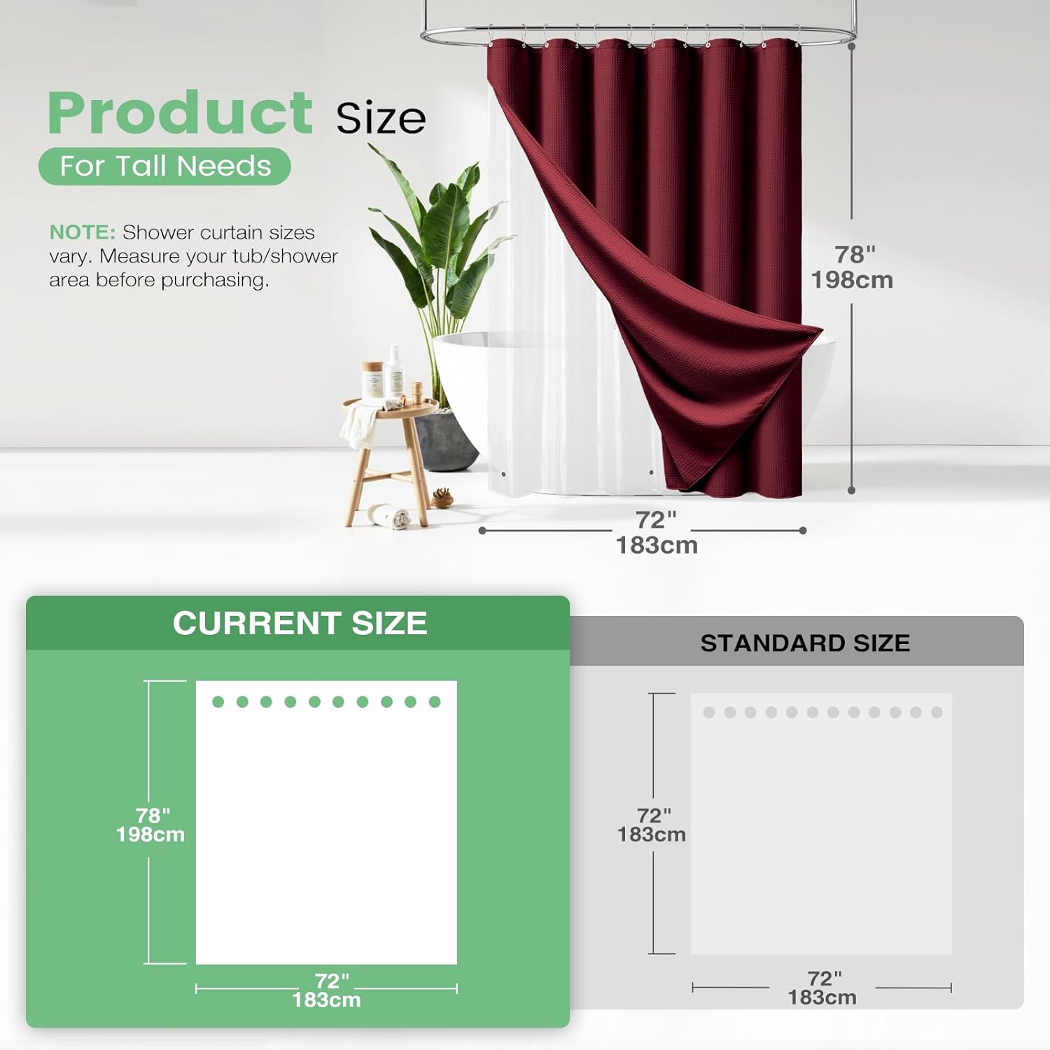 Elegant and Durable Fabric Shower Curtain with Waffle Weave ► PREMIUM QUALITY: 256 GSM heavy duty fabric shower curtain with classic waffle-weave pattern brighten up your bathroom with elegance and luxury. Simple design and fashionable appearance beautify your home decor. ► WATER REPELLENT: Hospitality standard and treatment for water repellent allows water to bead on the surface of the shower curtain. ► DURABLE: Extra Heavy duty fabric and tight hem keep the curtain from being torn up. Equipped with 12 rust-resistant metal grommets, this curtain enjoys lasting use. ► STANDARD MEASUREMENT: 72"*80" long shower curtain fits for your standard size. ► CARE INSTRUCTIONS: Machine wash cold; Gentle cycle; Don't bleach; Hang dry; No shrinkage, No deformation.